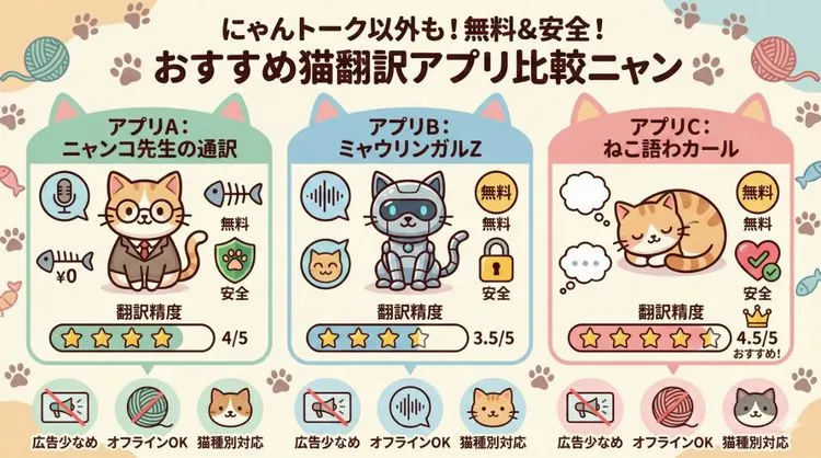 安全性、手軽さ、そしてコストパフォーマンスの観点から、にゃんトークの代替となりうるアプリを3つピックアップしました。
