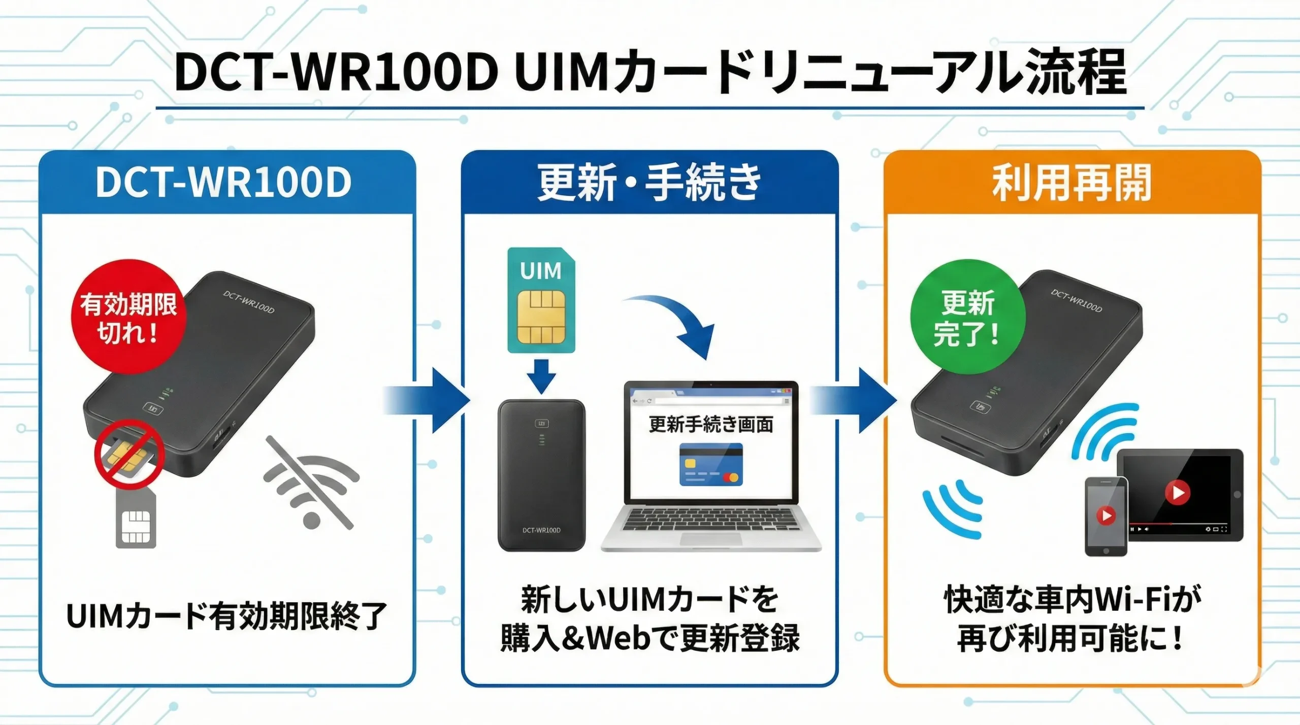 DCT-WR100Dの「更新」とは、新しいカードを買い替えることではなく、既存のUIMカードに対して「利用期間を追加購入(チャージ)」することを指します。