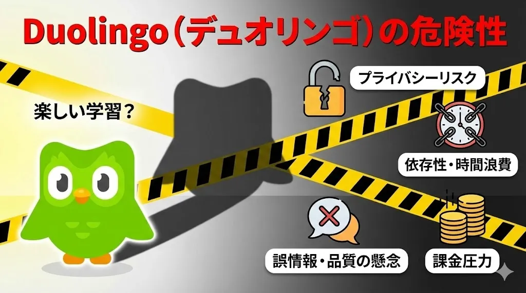 「Duolingo 危険性」と検索すると、個人情報の流出やセキュリティの話ばかりが出てきます。 もちろんそれらも重要ですが、600日以上このアプリを使い続けている筆者からすれば、それらは「本当の危険」ではありません。