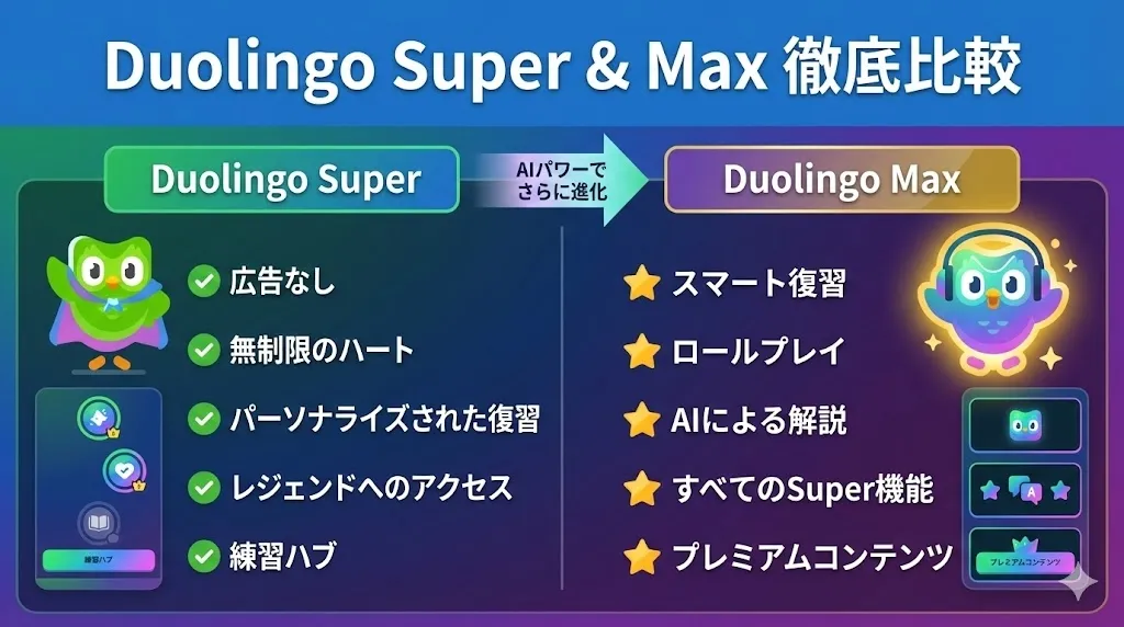 かつては「Duolingo Plus」と呼ばれていた有料プランは、現在「Super Duolingo」へと進化。さらに、OpenAIの最新AI技術を搭載した最上位プラン「Duolingo Max」も登場し、選択肢が増えて迷っている方も多いはずです。