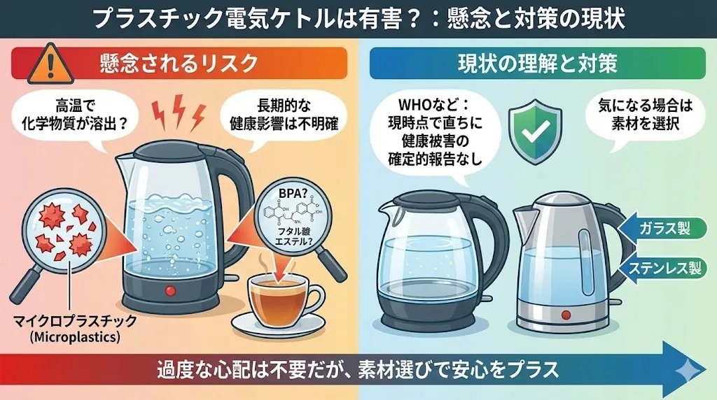 「電気ケトルのプラスチックは有害か?」という問いに対する答えをまとめます。