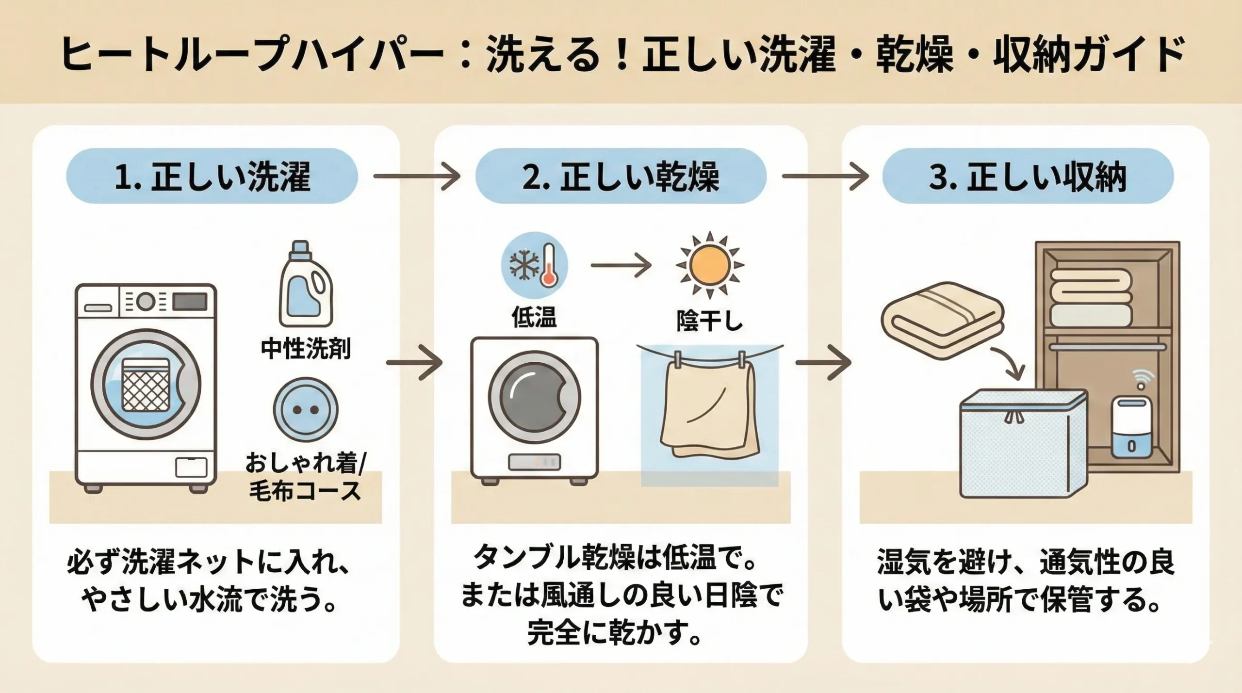 ・必ずネットに入れて「弱」で洗う ・乾燥機は使わず「陰干し」または「天日干し」 ・保管時は圧縮せず「ふんわり」収納