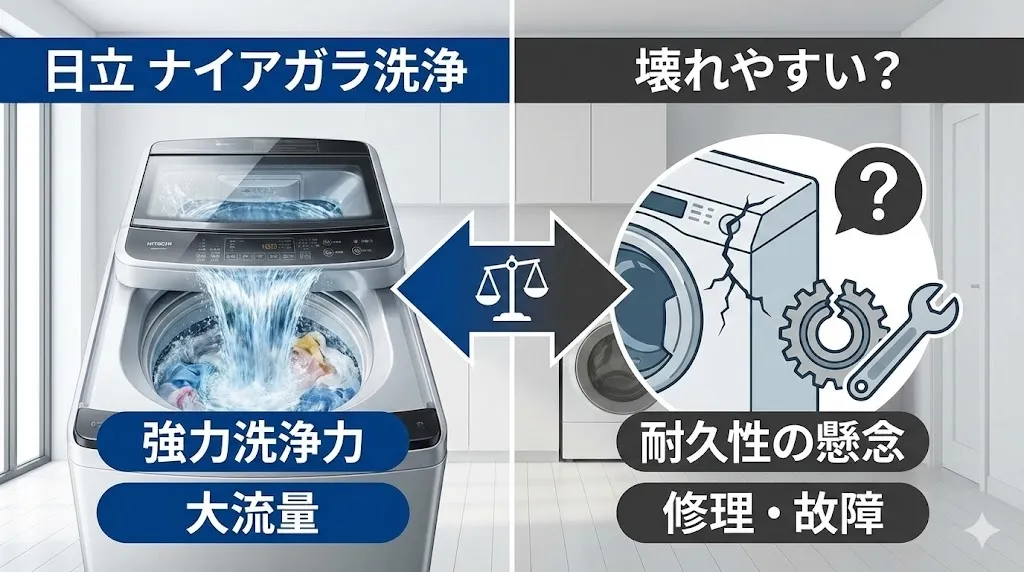 この記事では、日立の洗濯機が本当に壊れやすいのかという疑問に答えつつ、乾燥方式の変更が電気代に与える具体的な影響や、独自の強みである「ナイアガラ洗浄」「風アイロン」の実力について徹底解説します。