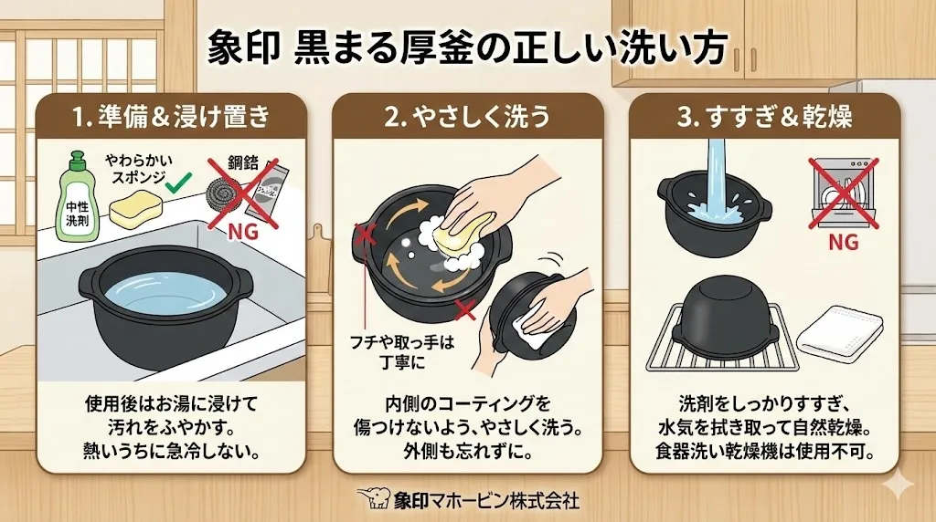 黒まる厚釜を洗う時の正しい手順と道具選び