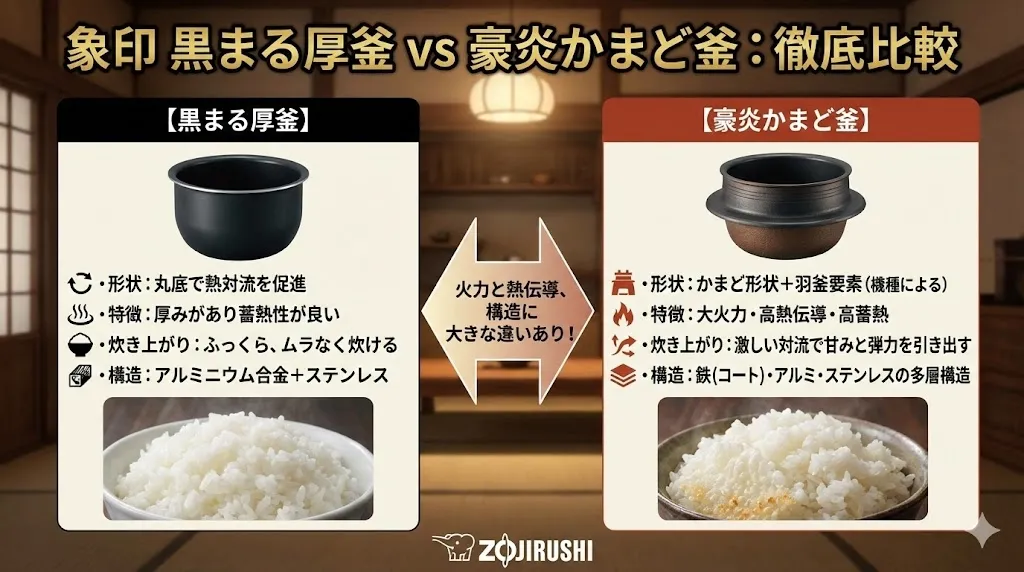 簡単に言えば、黒まる厚釜は「使いやすさと美味しさのバランス型」、豪炎かまど釜は「美味しさのために全てを捧げた追求型」と言えます。