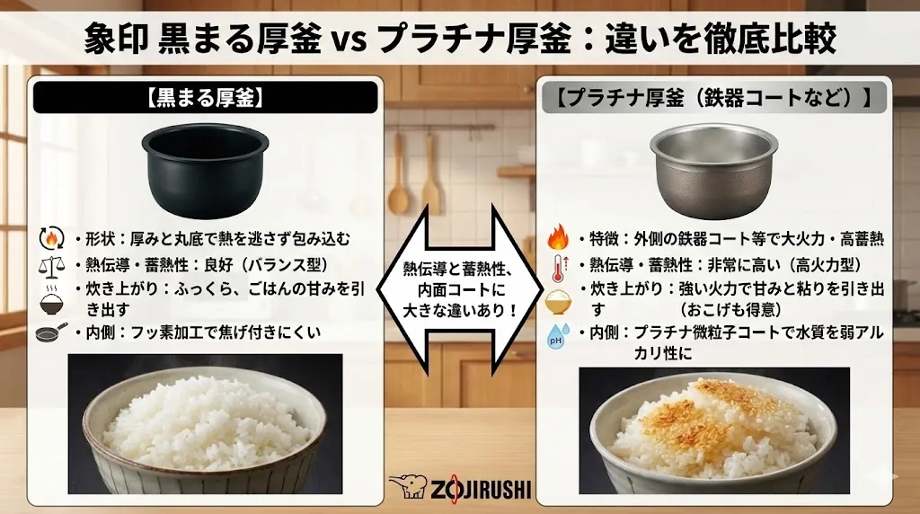 簡単に言えば、黒まる厚釜は「美味しく炊くための基礎体力が高い釜」であり、プラチナ厚釜はそれに加えて「甘みを増幅させる特殊能力を持った釜」と言えます。
