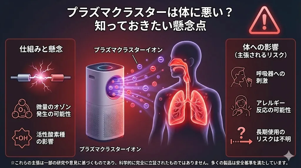 プラズマクラスター自体が直ちに害になるという報告はありませんが、以下の点に注意してください。