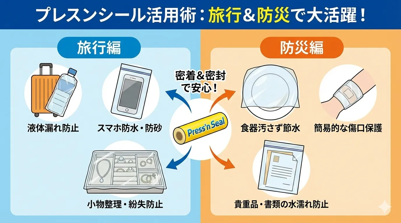 実はその高い密着力と防水性を活かせば、家事の時短はもちろん、旅行のパッキングや万が一の防災グッズとしても最強のアイテムに変わります。