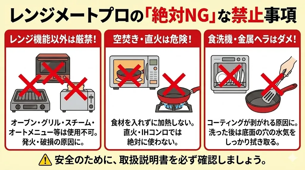 そんな悲しい事故を防ぐために、今回は「レンジメートプロで絶対にしてはいけないこと(禁止事項)」を、その「理由」とともに徹底的に深掘り解説します。