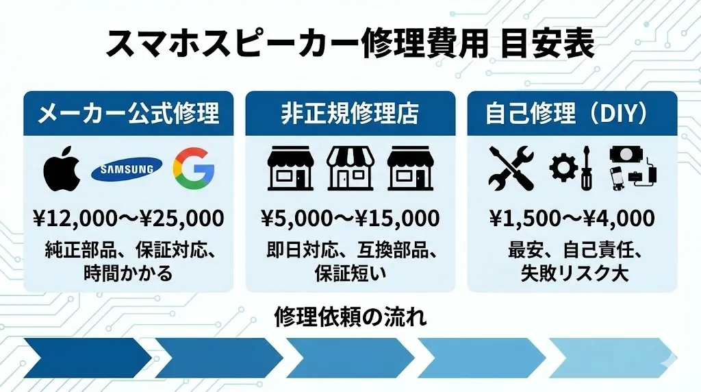 保証に入っていない場合、メーカーでの修理は高額になりがちです。そこで選択肢に入るのが、スマホスピタルなどの「街の修理店(第三者修理業者)」です。 スピーカー部品(イヤースピーカーまたはラウドスピーカー)の交換修理の相場は以下の通りです。