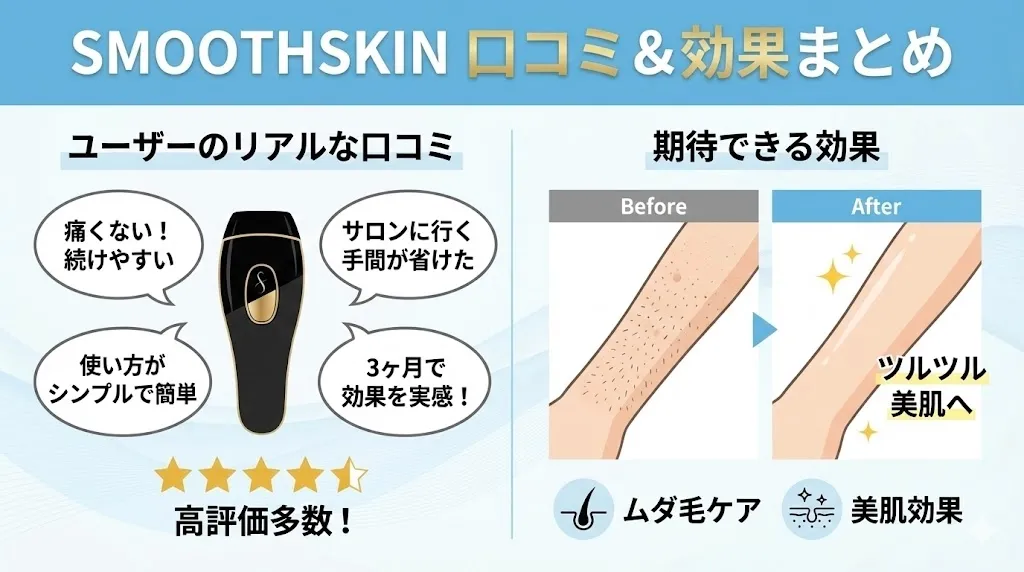 スムーズスキンは、家庭用脱毛器の中でも「効果」「スピード」「安全性」のバランスが極めて高いレベルでまとまっている製品です。