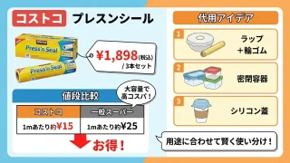 おすすめ・掘りだしものコストコのプレスンシールは本当に得?値段比較と業務スーパー・100均で買える代用アイデア プレスンシールは魔法のように便利ですが、普通のラップに比べると「高い」と感じることはありませんか? ・毎日使うにはもったいない ・100均の似たやつで代用できないの? そんな疑問を持つ賢い消費者のために、本記事ではプレスンシールの本当の...2025年12月14日おすすめ・掘りだしもの