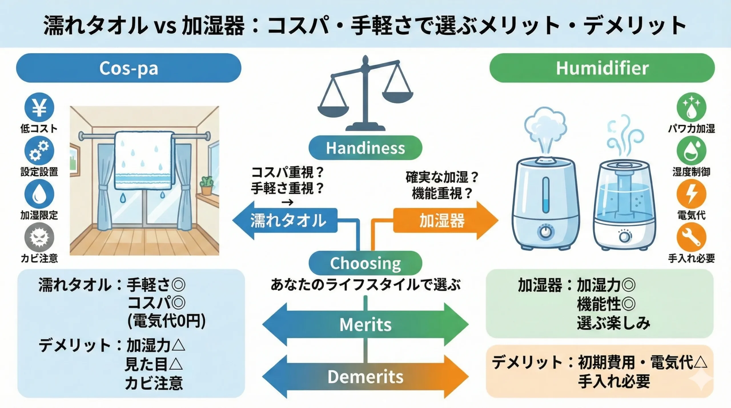 どちらか一つに絞る必要はありません。 例えば、「リビングには加湿器を置き、寝室は濡れタオルで済ませる」といった使い分けも賢い方法です。